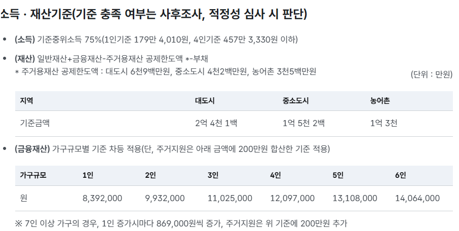 지원요건 예시: 소득이 기준중위소득 75% 이하, 재산 규모가 일정 기준 이하일 경우 신청 가능.