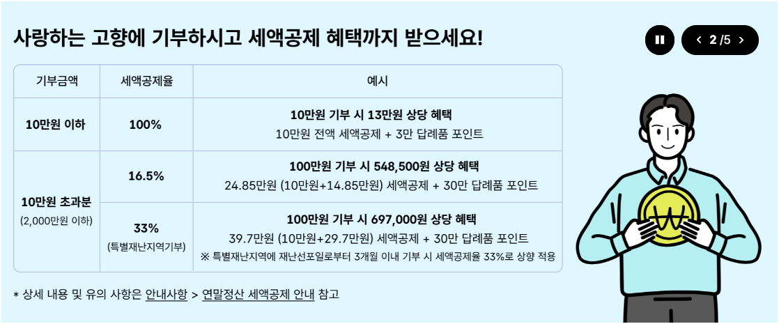 기부금액이 큰 경우, 기부금 한도 초과 문제도 체크해야 합니다. 고향사랑기부제 기부금은 ‘이월 공제’가 불가능해 해당 과세연도에만 적용되기 때문에 과도한 기부는 공제 누락을 유발할 수 있습니다. 따라서 연말정산 직전에는 홈택스에서 총 기부금액을 조회한 뒤 부족하거나 초과된 금액이 없는지 점검해야 합니다.