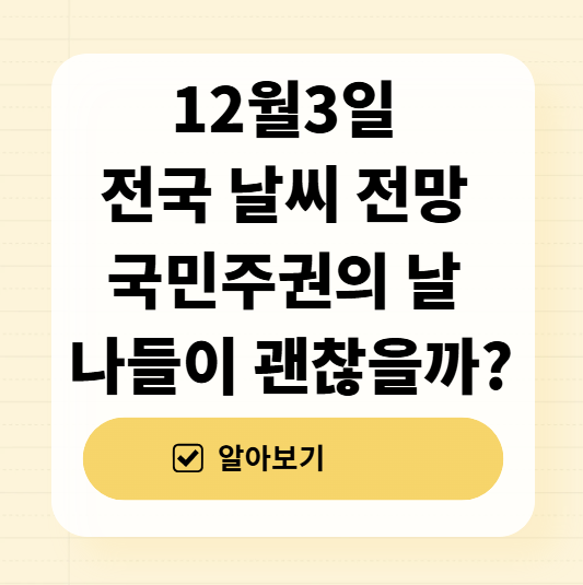 12월 3일은 최근 사회적으로 관심이 집중된 날입니다. 정치권에서 ‘국민주권의 날’로 지정하자는 논의가 이어지면서 이 날짜 자체가 검색어로 오르내리고 있습니다. 특히 관련 법안 도입 논의가 보도된 이후, 해당 날짜에 맞춘 전국 날씨와 생활 정보에 대한 관심도 함께 증가한 상황입니다. 날씨는 국민 생활과 밀접하게 연결되기 때문에 “12월 3일에 외출해도 될까?”, “기념행사가 열린다면 어떤 날씨가 될까?” 같은 질문들이 자연스럽게 늘어납니다. 이 글은 기상청 예보 체계를 기준으로 12월 3일 전국 날씨 흐름과 생활 팁을 정리하고, 현재 논의 중인 국민주권의 날 논의 동향을 설명드리겠습니다.