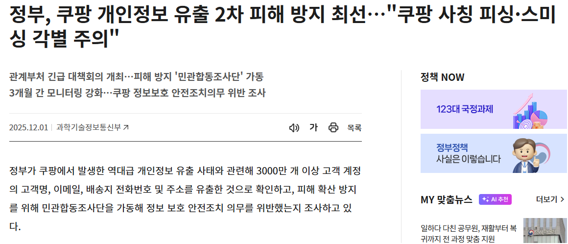 정부가쿠팡에서 발생한 역대급 개인정보 유출 사태와 관련해 3000만 개 이상 고객 계정의 고객명, 이메일, 배송지 전화번호 및 주소를 유출한 것으로 확인하고, 피해 확산 방지를 위 - 정책브리핑