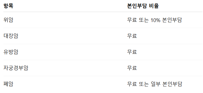 ※ 자궁경부암, 유방암, 대장암은 전액 무료 지원이 일반적입니다.