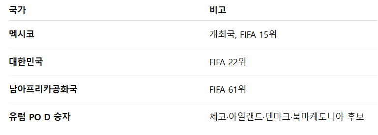 2026 북중미 월드컵 조추첨 결과가 발표되면서한국이 속한 A조의 마지막 퍼즐(유럽 플레이오프 D 승자)에 대한 관심이 폭발적으로 높아졌습니다.한국은 멕시코·남아프리카공화국과 함께 A조에